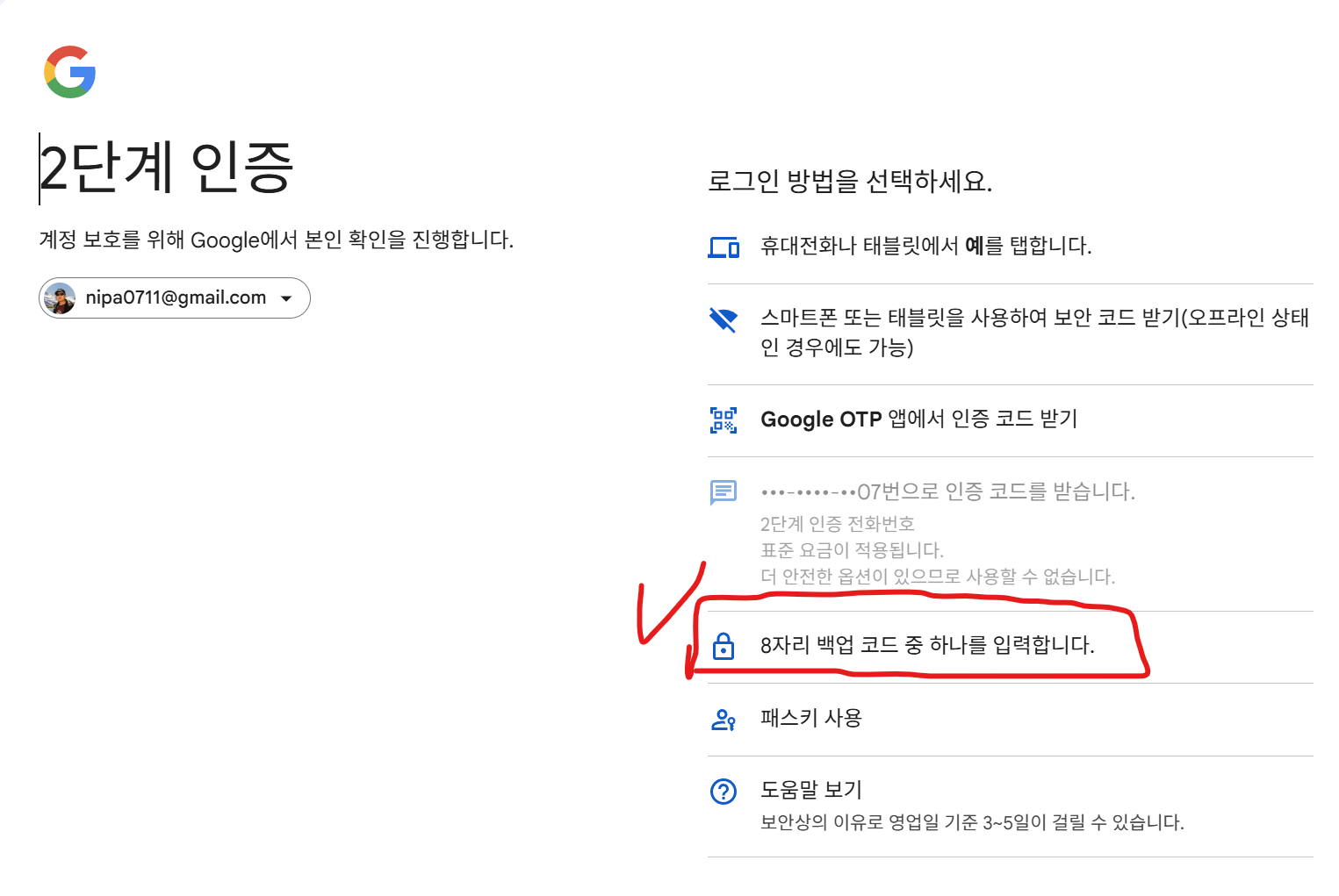 그리고, 지금 여러분은 휴대폰이 분실된 상태에서 구글에 로그인을 시도하고 있습니다.