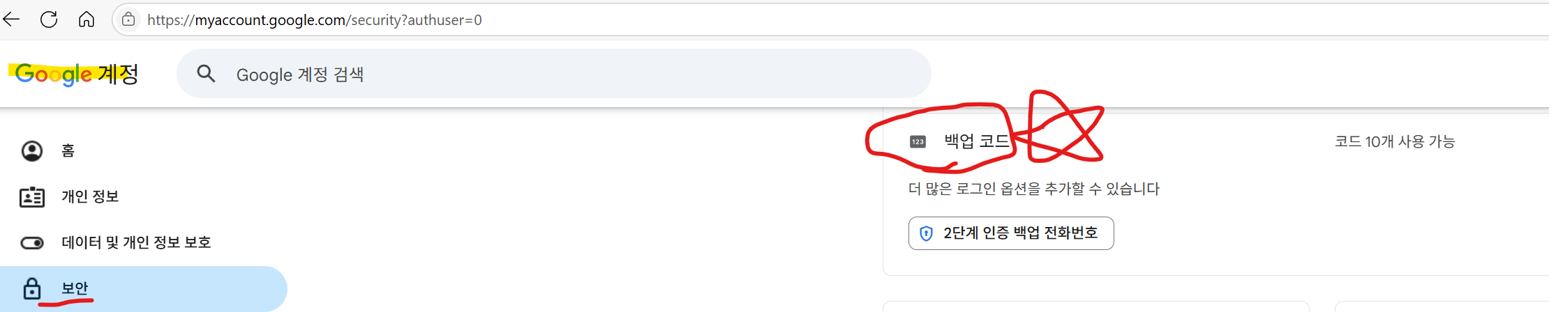 그 아래쪽에 보면 백업 코드 라는 것이 있습니다.